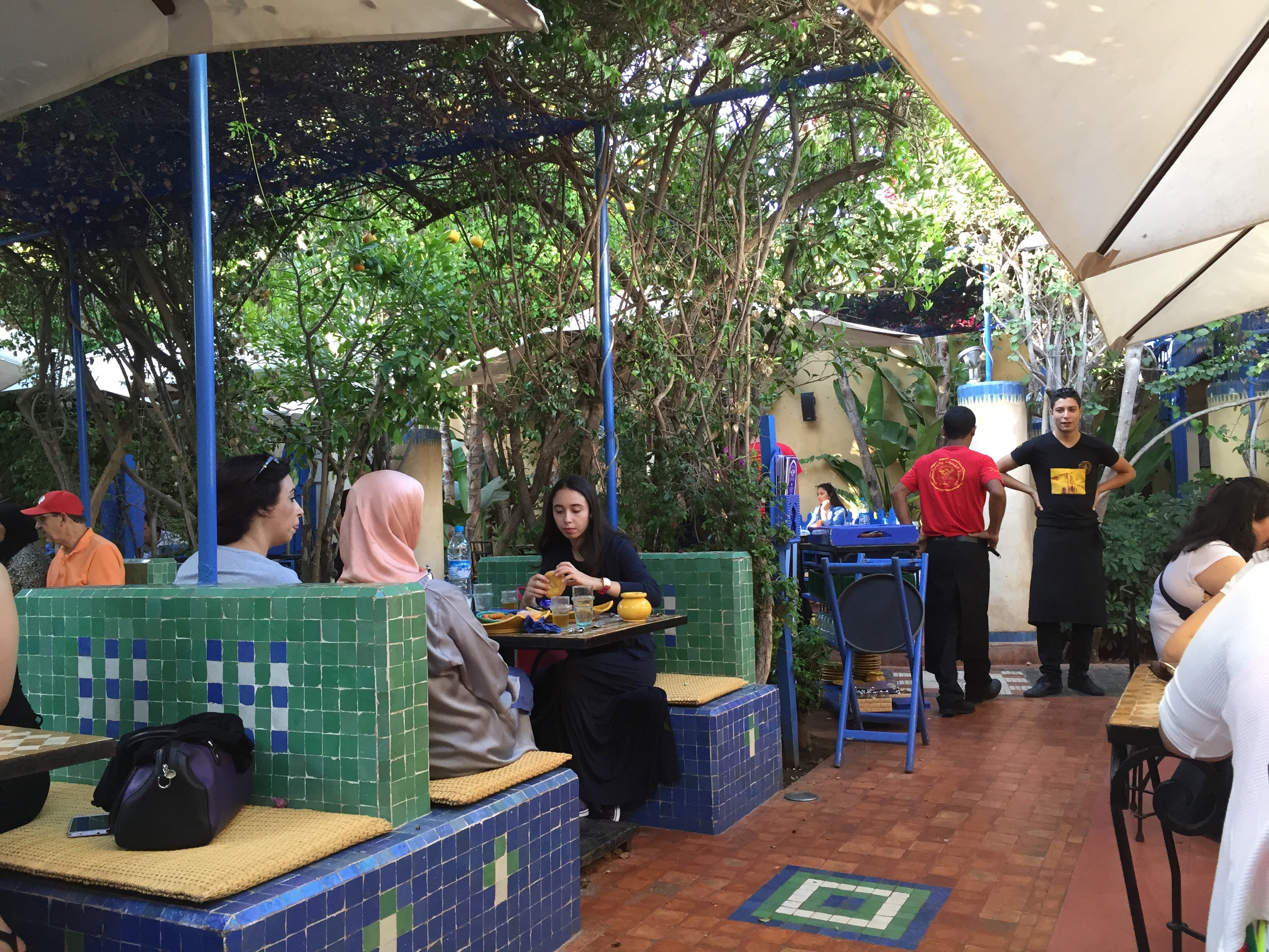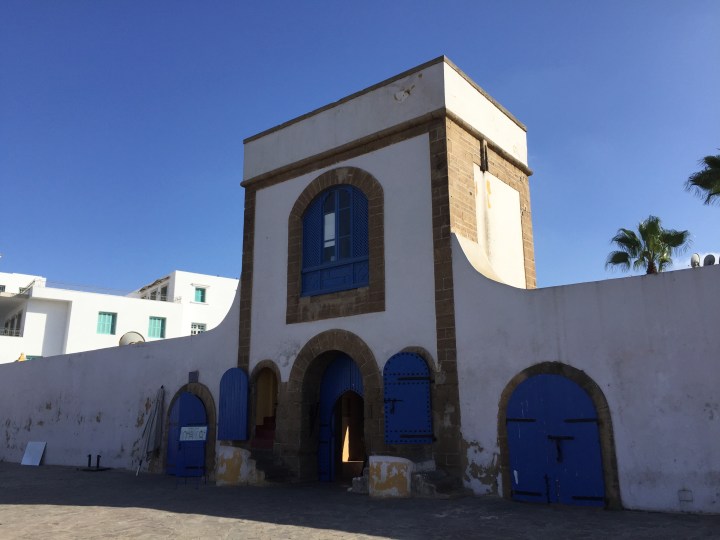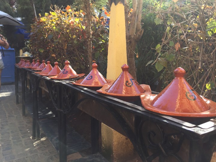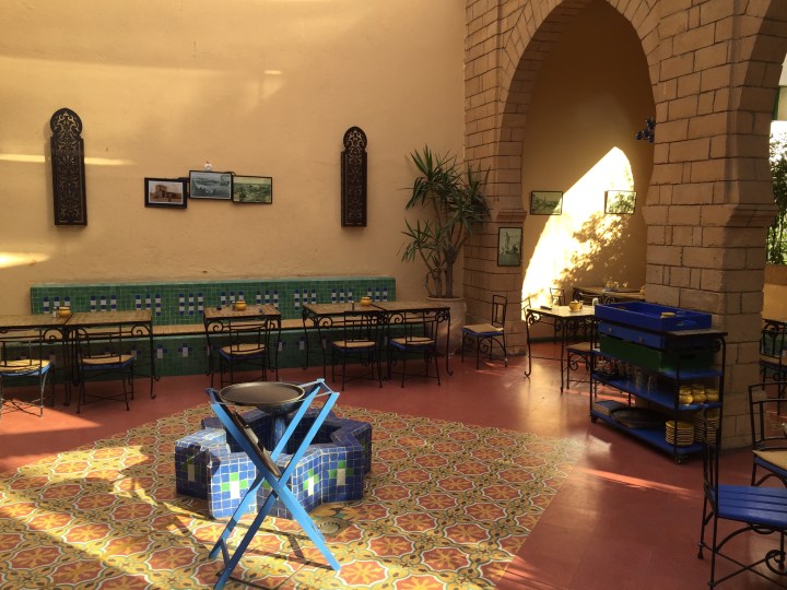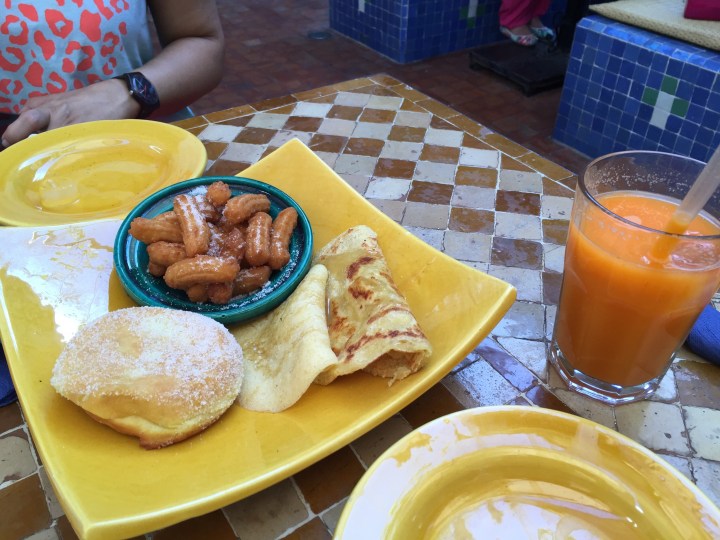 Al salir de la medina, caminamos rodéandola, buscando la costa (decepción: es puerto o playa rocosa ahí en el centro). Por curiosas y de casualidad encontramos un lugar que estaba en nuestras guías y en todo sitio donde buscamos recomendaciones: La Sqala (o casa Maure). Es una reja celeste, que nos llamó la atención porque arriba había unos cañones y una explanada (secretamente creo que fueron los aromas a bollería), y que varios entraban directamente (y no lucían como turistas). Entramos. Al fin, mágico mundo. Un jardín secreto, tajines, decoración colorida y una fuente, lleno de gente. Casi como un bar de Palermo. Jugos de todos los colores, tés y café y bollos: nuestro lugar en el mundo. Pedimos una degustación de churros, panqueques y una especie de bola de fraile (beignets) con mermelada de frutilla. Lástima no haber podido probar los tajines, pero fue una grata sorpresa.