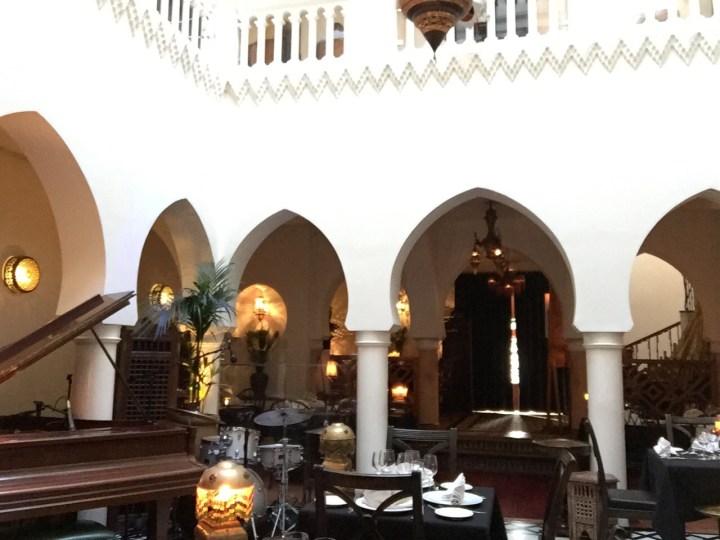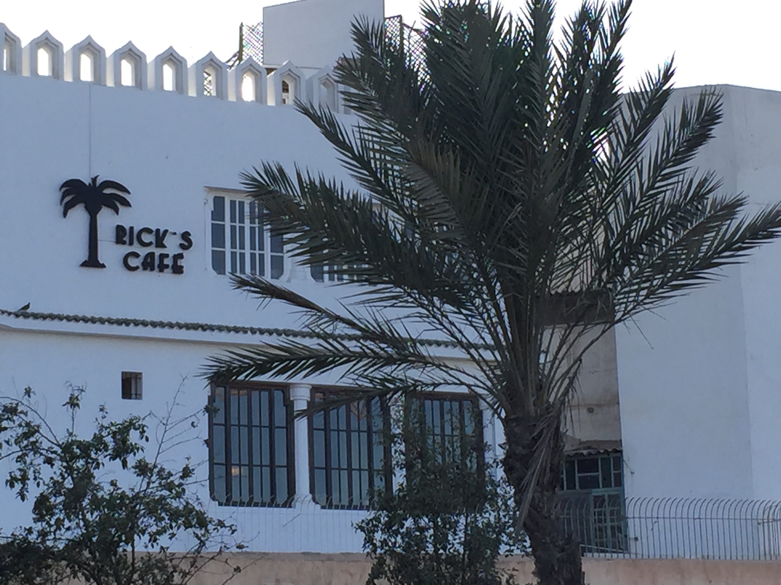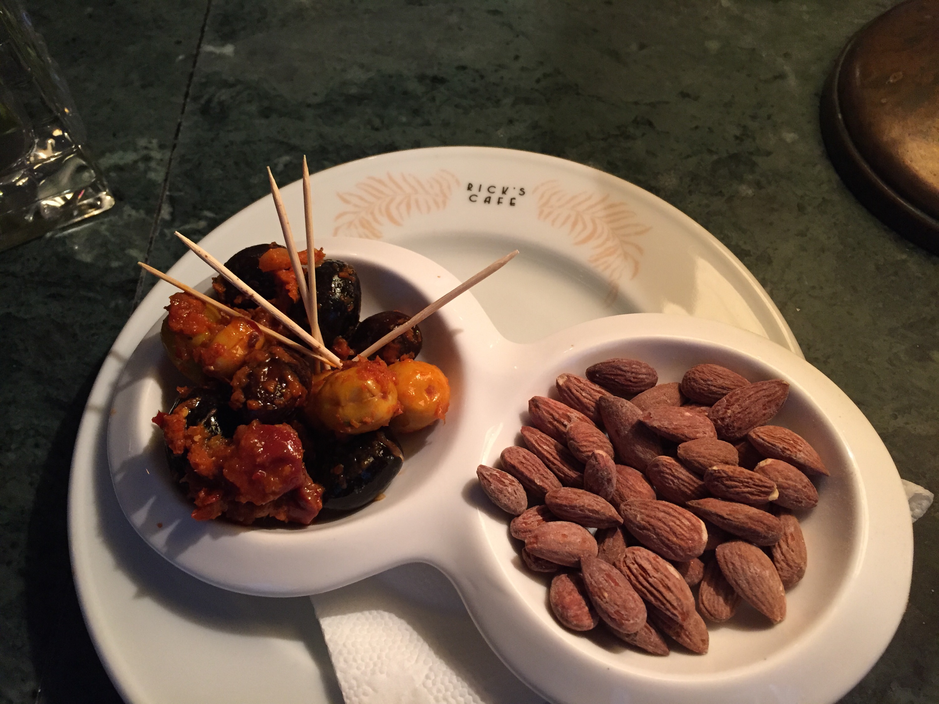 Una vez con la panza llena, seguimos caminando. Casi a punto de llegar, la zona no era muy recomendable y no pintaba lindo, así que haciendo marcha atrás encontramos el Rick’s café, un bar que rememora la magia de la película Casablanca. Insistí y entramos. Lleno de mozos buenmozos, y una carta con tragos. Pedimos algo para tomar en la barra, que vino acompañado de unas increíbles aceitunas marinadas con especies y almendras saladas. Todo aludía a aquellas épocas que no dudo Casablanca supo tener. No será el original, pero lo recomiendo. Otra vez, era para comer un rico tajine y probar los vinos de la región (o los franceses, si el presupuesto lo permite).