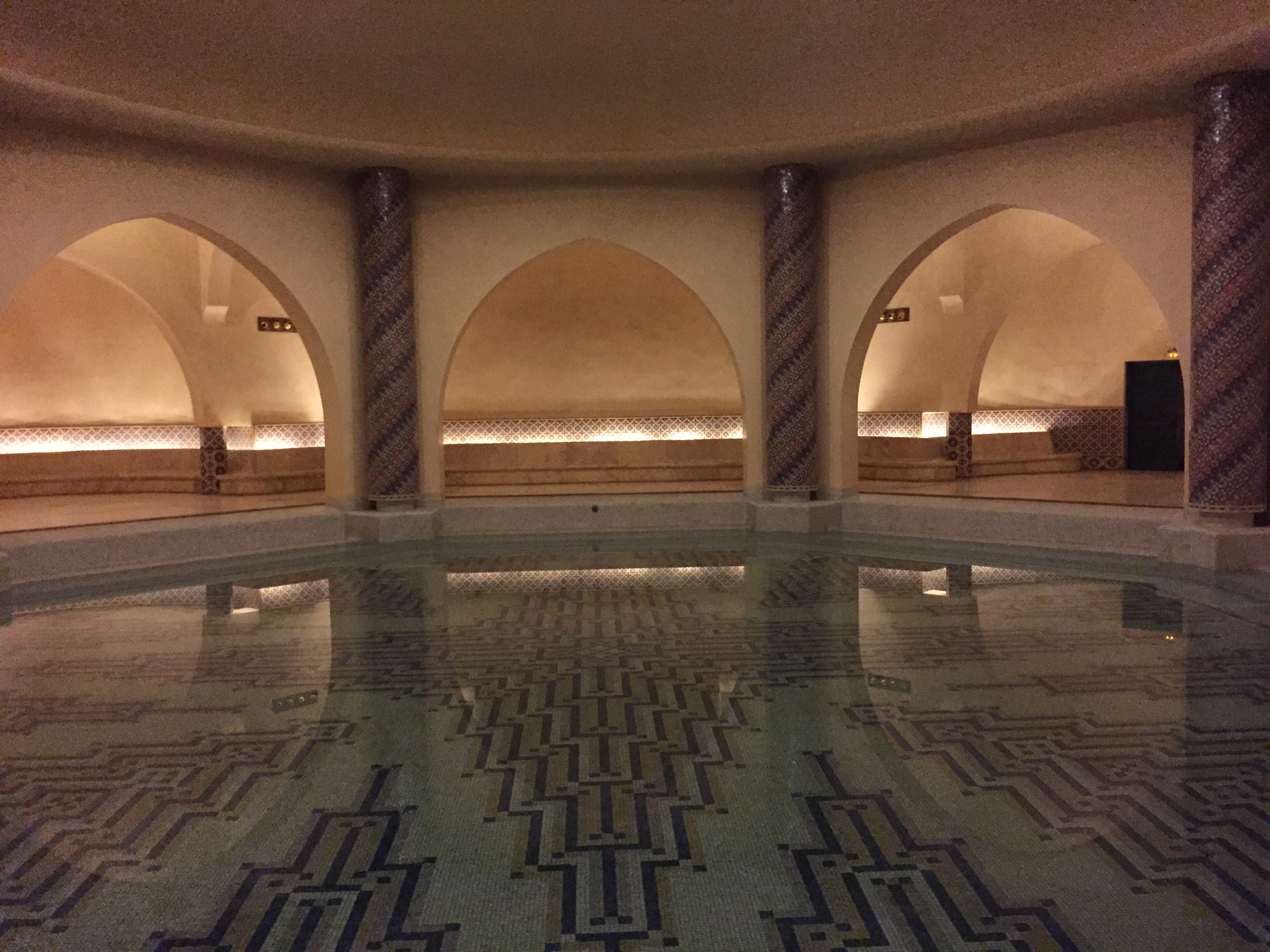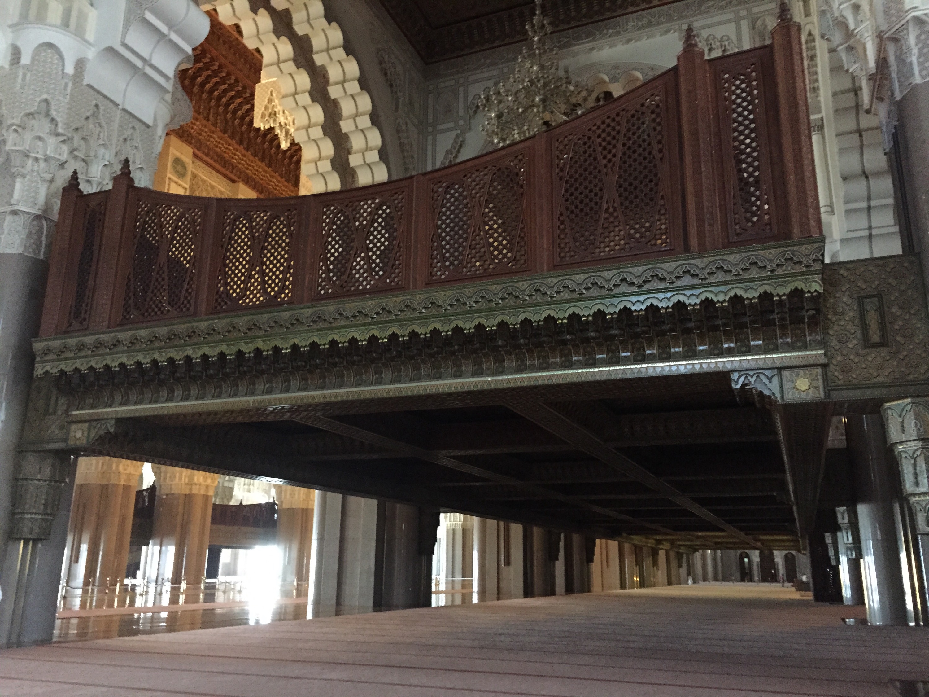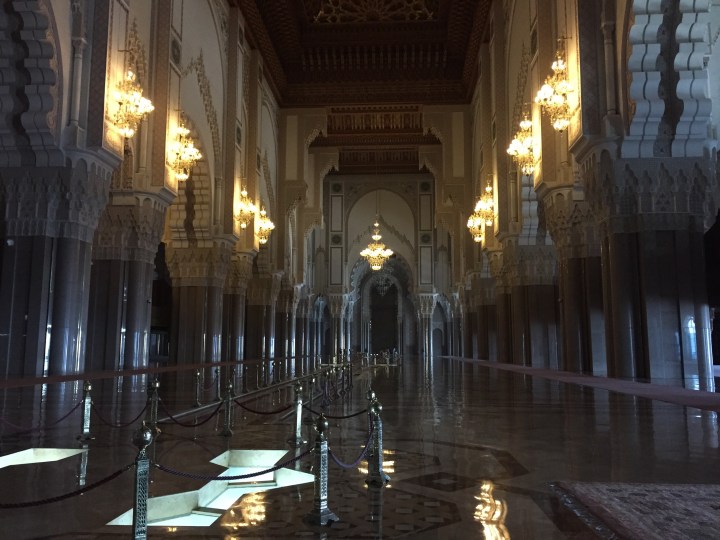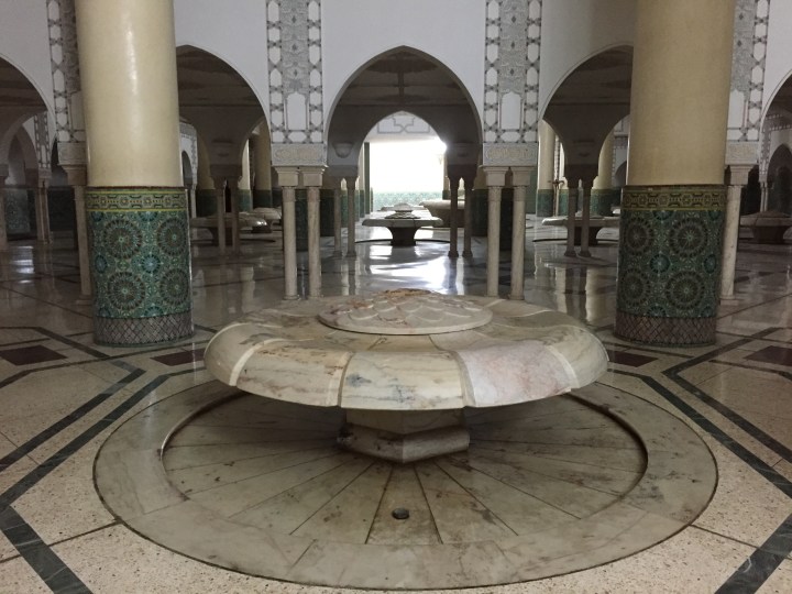 Se visita la sala de oraciones, que es impresionante y vienen vale la visita, todo adornado bellamente al estilo marroquí, la sala de abluciones, que es donde se lavan antes y después de orar, y el hamman, que es increíble pero solo funciona para la visita. En la sala de oraciones hay dos entrepisos que es el lugar destinado a las mujeres (hombres y mujeres no rezan juntos). Un tip esencial que le agradezco a Noe es que a la entrada a esta sala hay que descalzarse. Para aquellos a los que les da impresión andar en patas por zonas de tránsito común, aunque sean alfombras, les recomiendo llevar de antemano un par de medias. Nosotras aprovechamos las medias descartables que nos dieron en el avión. También les piden a las mujeres que se cubran los hombros. No es necesario la cabeza. Dejan sacar fotos en todos lados y los guías son muy copados. Afifa, la nuestra, tenía además un humor argentino, bastante ácido. Entre nosotros, es una mezquita turística. A ciencia cierta no se sabe si fuese antes o después del delirio financiero que supuso y que a los marroquíes no les causó mucha gracia. Así que nuestra visita está amortizando los 600 millones de dólares que se patinaron en su construcción.