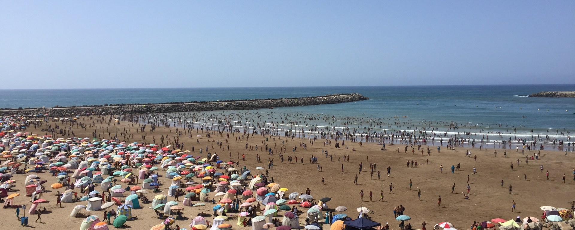 Salimos por una puerta perpendicular a la entrada, a mitad de camino, y tomamos por el Boulevard Misr, a la derecha, rumbo a la playa. Bordeamos el cementerio y desembocamos en la costa. Es medio rocosa así que seguimos a los locales, quienes nos llevaron hasta una de las pequeñas playas. Hay dos, separadas por un malecón. En pleno verano, luce como la Bristol de Mar del plata la primera quincena de enero: repleta de gente y sombrillas. Digamos que no vale la pena el viaje para visitar la playa, pero para refrescar los pies en una tarde sofocante es una opción recomendable.