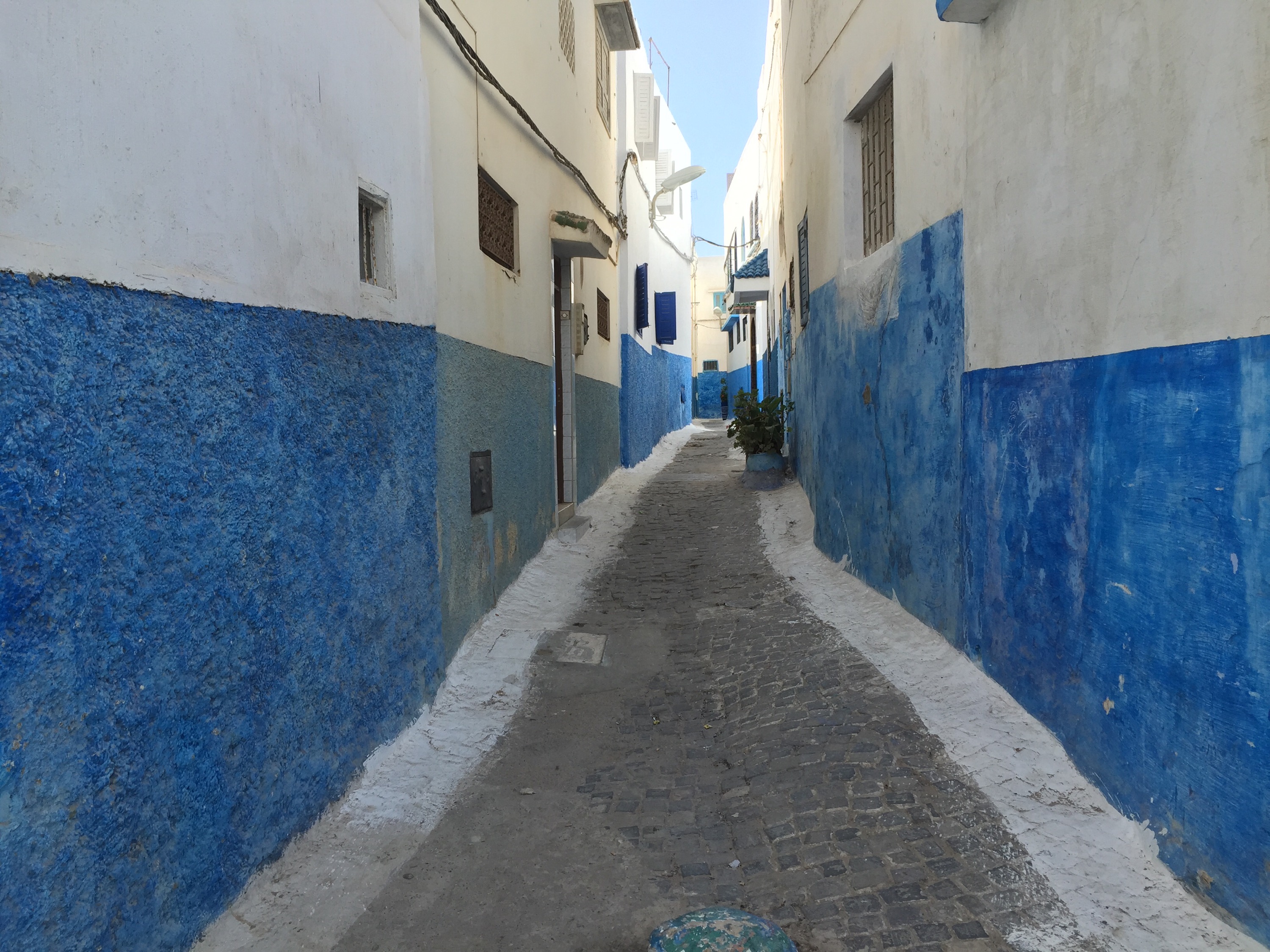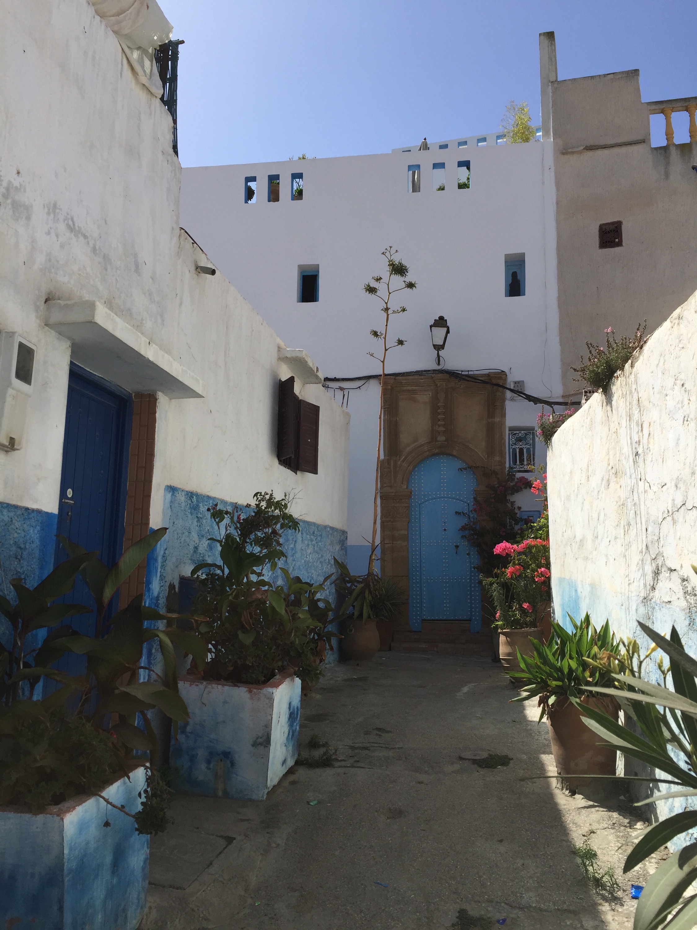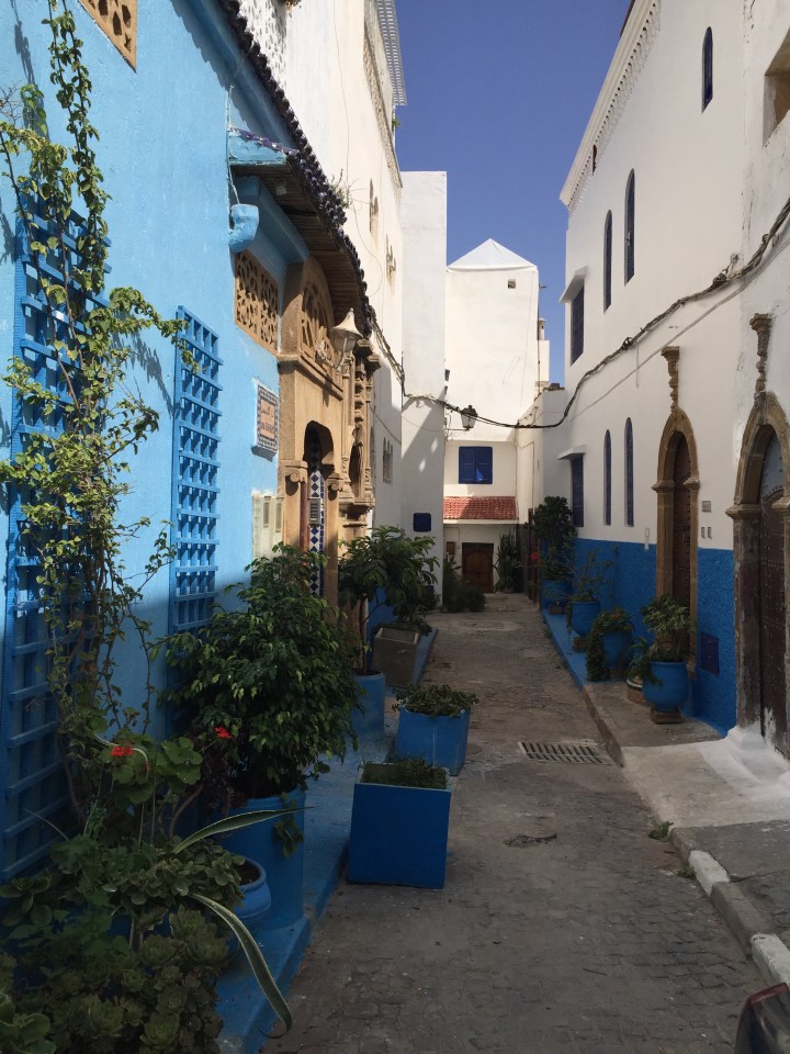 Subimos por una rampa desde la playa y aparecimos en una terraza con un excelente mirador para disfrutar la vista panorámica del mar. Entramos por una puerta de nuevo a la medina, a la parte que llaman el «barrio de los Oudayas». Acá tiene un aire a las islas griegas y pareció un adelanto de Chefchaouen: paredes blancas y puertas azules añil, flores y puertas bonitas.