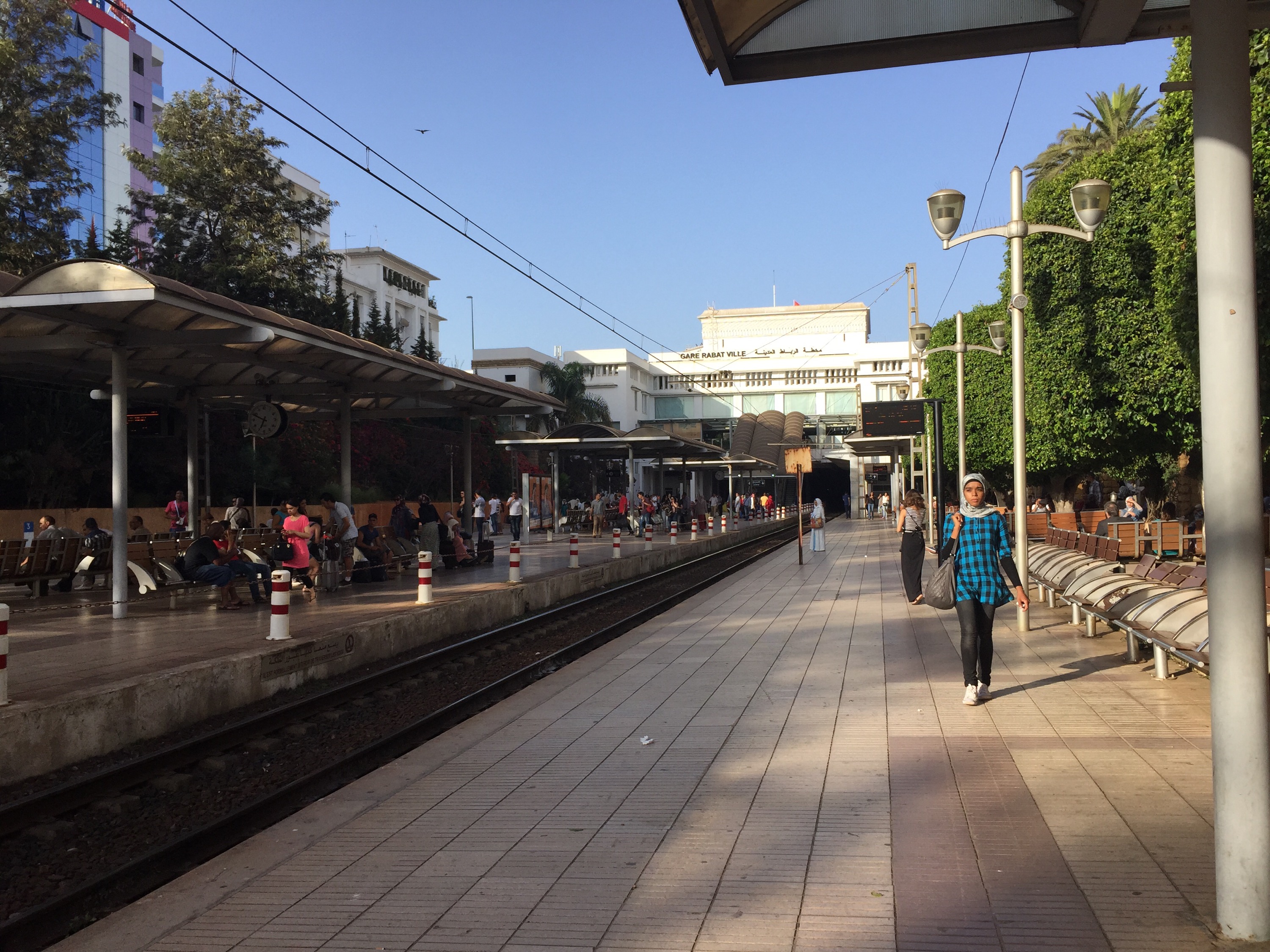 Llegamos en tren en algo más de media hora desde Casablanca. La estación céntrica es Rabat Ville y es más linda y moderna que la de Casablanca. Es amplia, con árboles, kiosco moderno y muy limpio y una excelente ubicación para poder moverse con comodidad tanto por la parte vieja como la nueva.