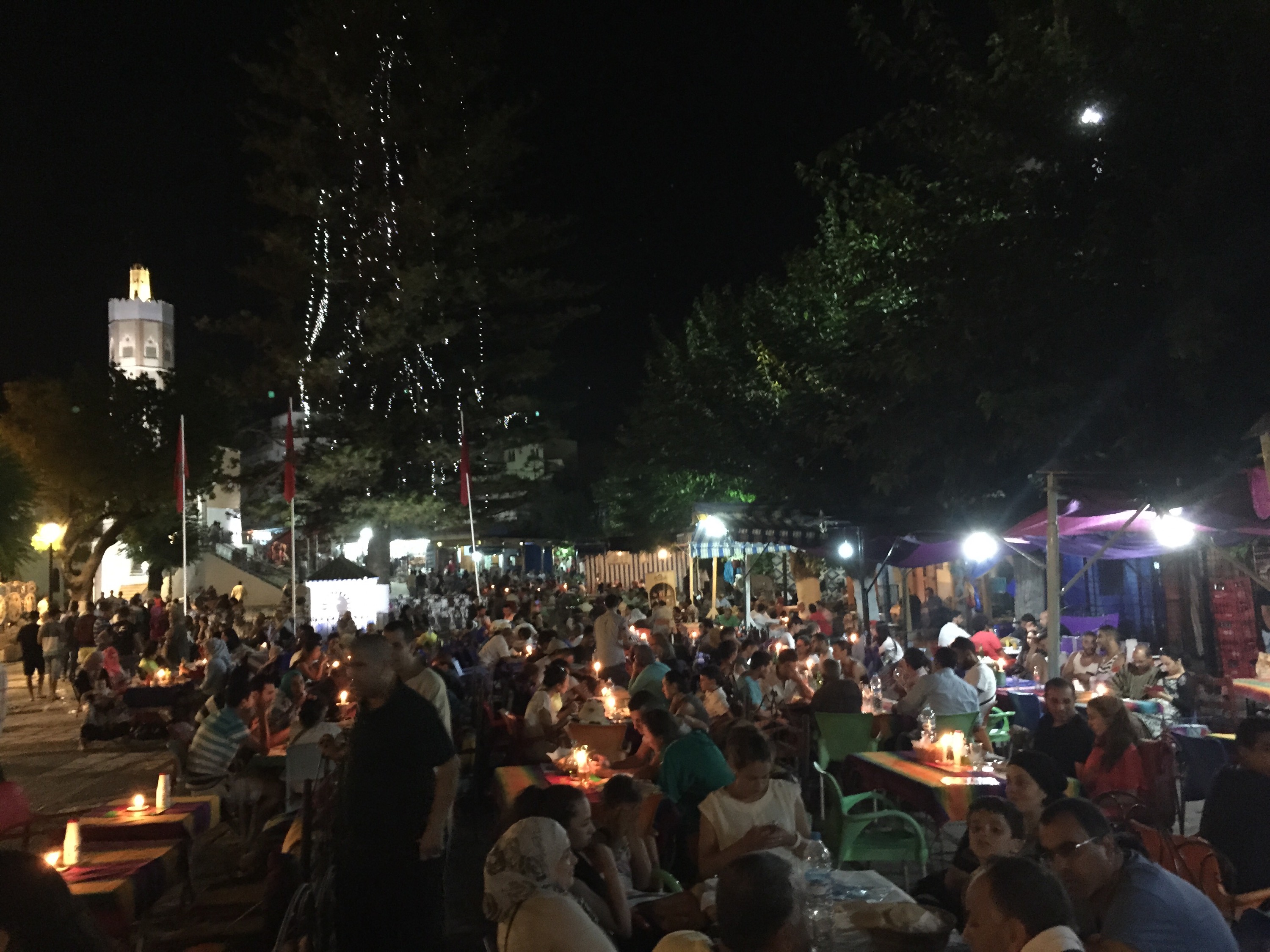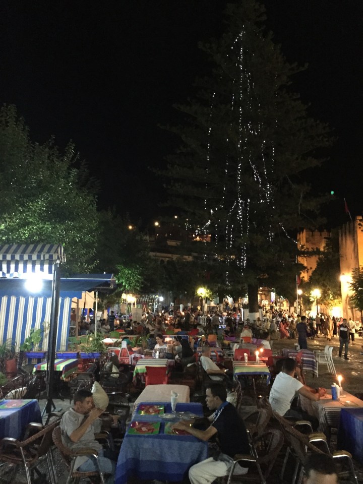 La plaza (por si quieren saber, se llama Uta El Hamman) es el centro neurálgico de la movida nocturna. Allí se encuentran casi todos los restaurantes. Lo más divertido es sentarse afuera para entretenerse mirando. Todo es interesante. Los muchachos tratan de convencerte para entrar. Aquí todo es comida tradicional y turística. No hay mucha diferencia y los platos son: ensalada marroquí, alguna sopa (que con 35 grados a la noche no es una opción viable), tajines, cous cous y, quizás, alguna pizza. Los precios son de lo más accesibles. Se puede comer más que bien por $75 dirhams.