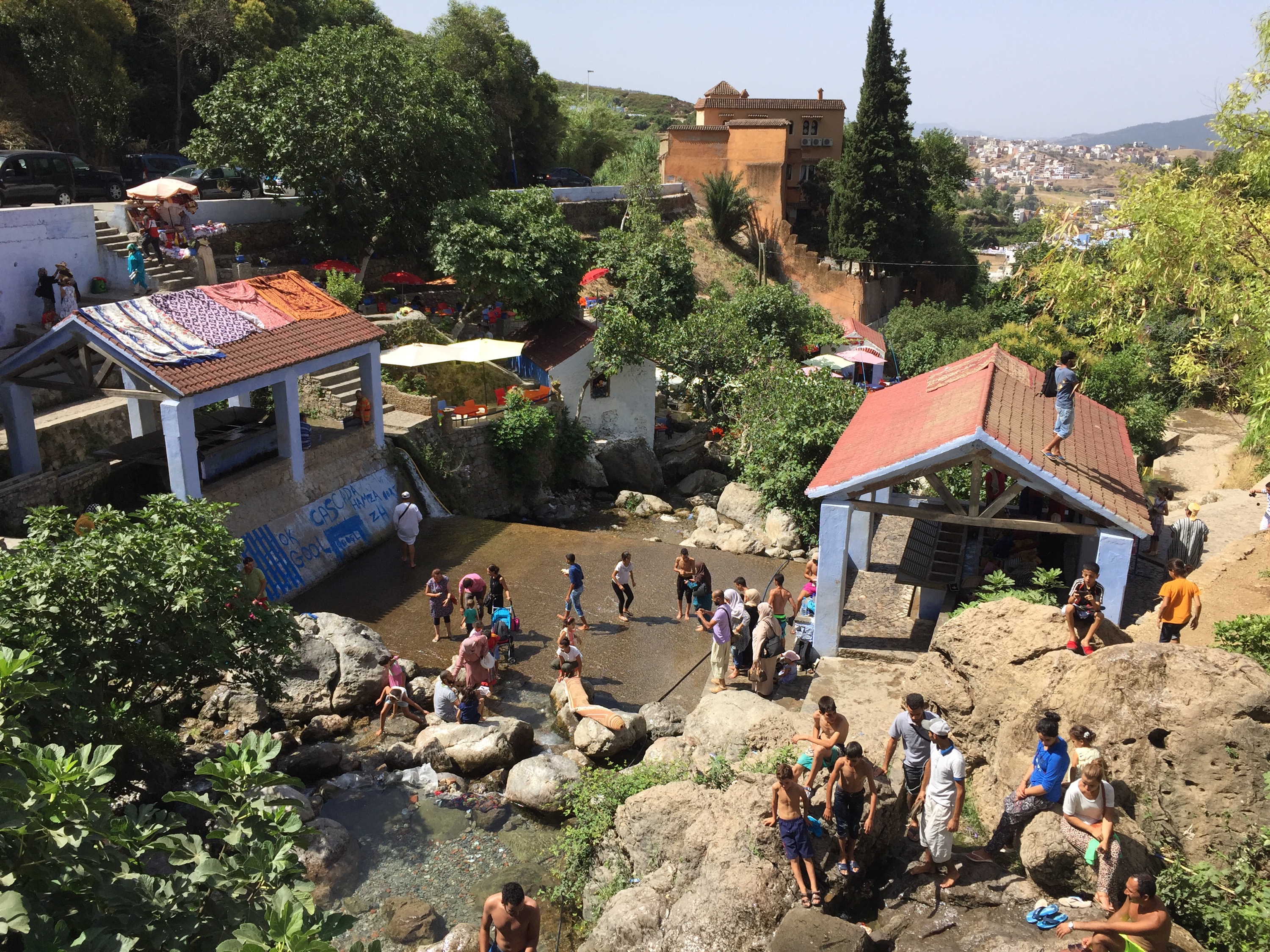 Hay unas pequeñas (muy pequeñas) cataratas hacia la izquierda de la medina. No son gran cosa, pero es un paseo y durante el día es uno de los lugares más frescos. En el punto neurálgico está el antiguo lavadero que aún se usa. Ahí las mujeres lavan las mantas y alfombras y las estiran al sol en la montaña para secarlas.