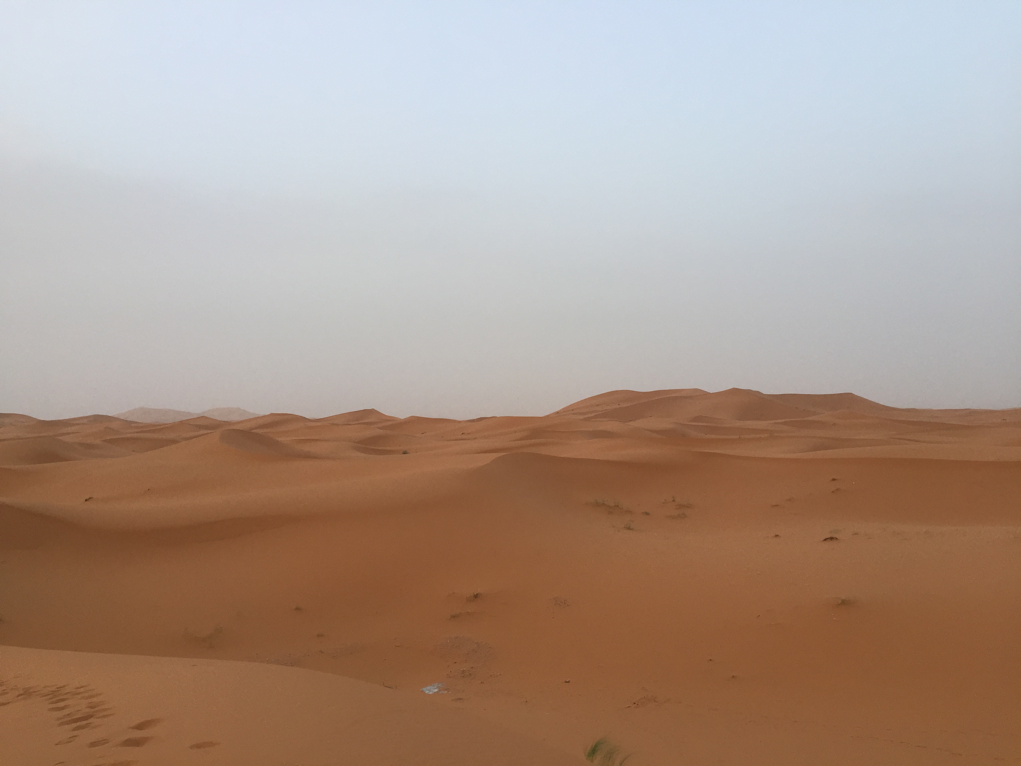 Faltaban pocos kilómetros para llegar a Merzouga y adentrarnos en el desierto cuando de pronto empezó a soplar una terrible tormenta de arena. Nuestros planes pendían de un hilo. Nuestras caras cambiaban su expresión a cada segundo: fastidio, frustración, negación, enojo. La naturaleza tenía la última palabra. En esas condiciones no íbamos a salir.